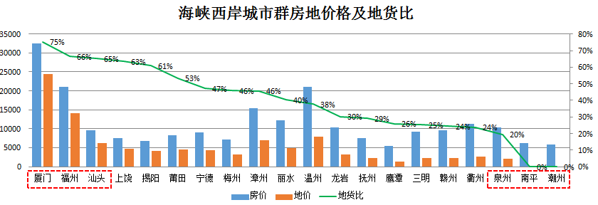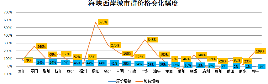 海峡西岸城市群房价平均涨幅为30%,地价平均涨幅为135%。房价涨幅高于城市群整体平均增幅的城市共有10个,分别为漳州、厦门、衢州、抚州、赣州、福州、揭阳、梅州、三明及宁德;地价涨幅高于城市群整体平均增幅的城市共有9个,分别为揭阳、上饶、梅州、厦门、南平、三明、抚州、汕头及鹰潭。