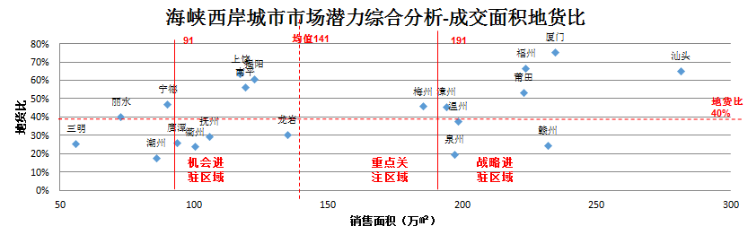 市场潜力从成交面积和地货比两个维度考虑,地货比较低且成交面积较大代表市场潜力较大。 战略进驻区域城市共3个,分别为赣州、温州及泉州;重点关注区域城市共0个;机会进驻区域城市共4个,分别为龙岩、抚州、衢州及鹰潭。