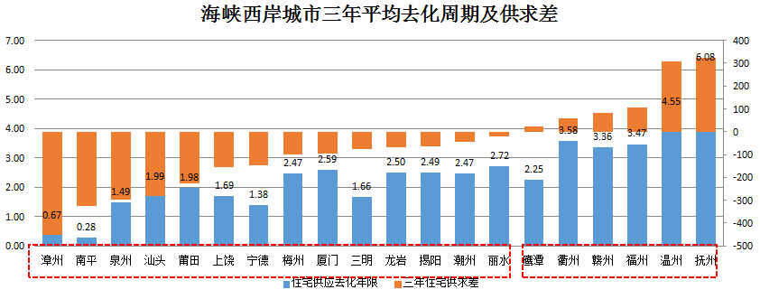 海峡西岸城市群住宅供应去化年限为2.48年,去化周期小于3年的有15个。整体来看,漳州、南平、泉州、汕头、莆田等城市市场供不应求;抚州、温州、抚州等城市市场供过于求。
