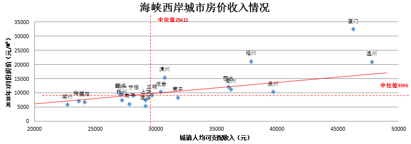 房价收入情况,在均值线下,居民收入较大且距离轴线向下偏离越大代表房价上涨潜力越强。重点关注城市有泉州、鹰潭;一般关注城市莆田、鹰潭、上饶、南平等城市。
