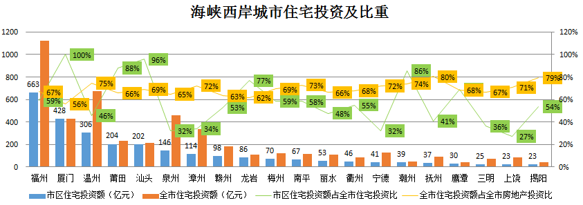 2016年海峡西岸城市群住宅投资额为4687亿元,住宅投资额在均值176亿元以上的城市有8个,分别为福州、温州、泉州、厦门、漳州、莆田、汕头及漳州。整个城市群住宅投资额占房地产投资额比重为67%,市区住宅投资占全市住宅投资的58%。市区住宅投资占比低于50%的城市有:温州、泉州、漳州、丽水、宁德、福州、三明及上饶,以上城市所辖县级城市房地产投资较为活跃,应重点关注。