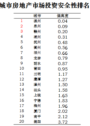 海峡西岸城市群城市房地产投资安全性综合排名TOP3的城市为:温州、泉州及赣州。偏离度大于1的城市投资风险较高,应谨慎投资,主要城市有揭阳、南平、厦门、梅州、宁德、上饶、汕头、漳州、鹰潭及三明。