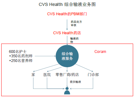 Coram所提供的输液服务的整个流程非常简单:患者在CVS Health的药房获取输液的药物后,到Coram所提供的专业场所、医院或患者家里,在护士或药剂师的帮助下进行输液。而整个综合输液服务与PBM的运营息息相关。