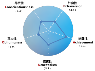 一般而言,在评估人格维度分数时,个体更倾向于表现出该维度低分值代表的行为,则此维度的分数在1-4分的区间内;个体更倾向于表现出该维度高分值代表的行为,则得分在7-10分的区间内;若无明显表现出低分行为或高分行为,则在4-7分的分数区间内。参照此范围标准,图1.2.2的大五职业性格画像中所描绘的性格特点预期会在进取性上展现出高分行为,在宜人性上表现出低分行为,而在尽责性、外向性、情绪性上处于中等水平。
