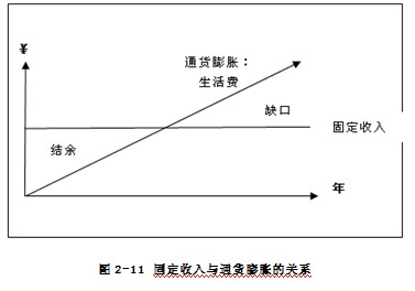 一般提供固定收入的投资工具,如银行定存、债券等,在经过一段时间后,会被逐年增加的通货膨胀超越(见图2-11),对退休后的中老年人,将形成一大威胁。这也就是把收入来源广泛分散的原因,利息可多可少,房屋租金及股利却会逐年提高,能让投资人追得上通货膨胀。
