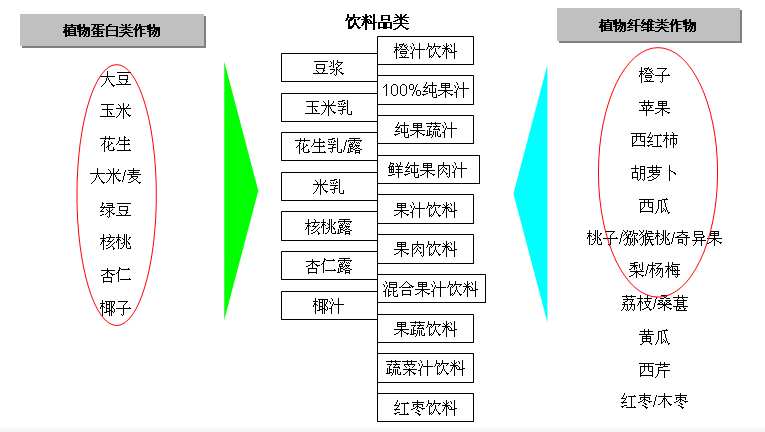 植物饮料大品类可以分为植物蛋白饮料与植物纤维饮料两大基本类别,这两个类别饮料分别以相应的植物类作物为原料,都是植物饮料品类中极有前景的品类。