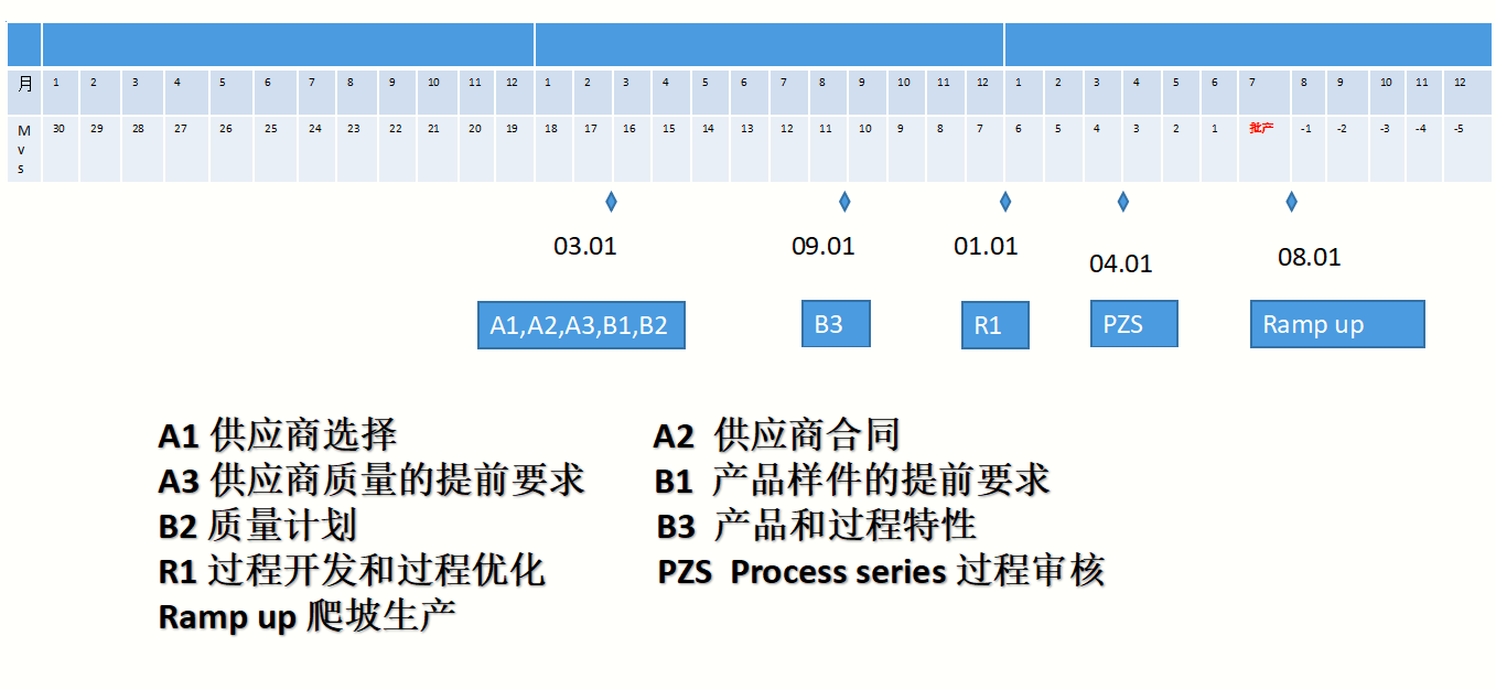 这包括新车开发的里程碑(各个公司的表现手段是不一样的,一般都会标注出重要的时间节点)。例如,图6-1是我们一次项目的零部件采购时间表的示例。