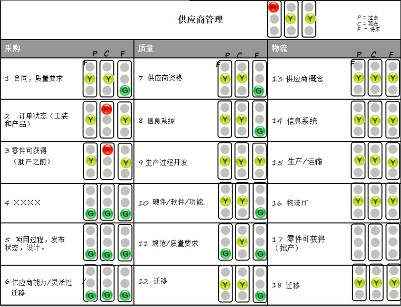 它是对供应商在采购、质量和物流方面的一个总的评价,并用颜色来表明状态和风险的项目。