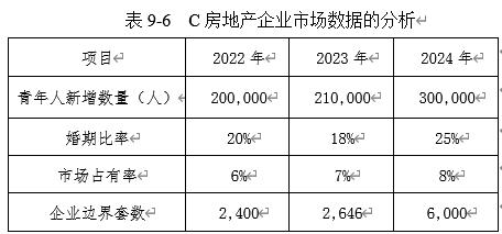 因此,在有精准的企业客户画像的情况下,还需要在恰当的时间顺势而为。管理者在决策收入计划和金额时,需要结合客户的实际情况来进行规划,并要求销售总监按照预期的三个方面的情况进行测算:青年人的数据、进入婚期青年人的数据比率以及企业预计的同行市场占有率。举例来说,C房地产企业市场数据的分析如表9-6所示。