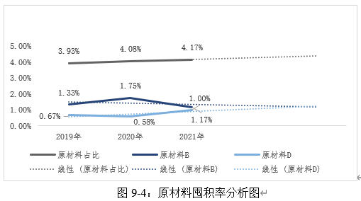 要解决存货积压问题,管理者需要深入挖掘导致积压的具体产品。这需要对存货的细项进行详细分析。如图9-4所示,通过分析原材料囤积率,发现原材料B的囤积率正在上升。因此,管理者应关注原材料B的采购和使用情况,并设定合理的原材料囤积率标准。例如,可以设定原材料囤积率必须低于去年的水平,并将此标准纳入采购部门的工作任务中,作为薪酬控制的一个因素。