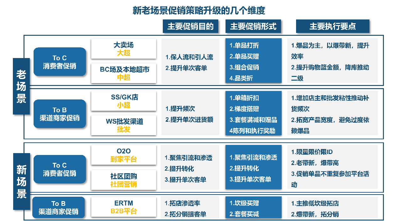 这张新老场景的促销策略升级地图是送给每一位一线城市经理的小小锦囊,疫情期间各地各渠道一定压了很多货,很多产品也进一步临期,在迫不及待复工复产的当下,请各位务必保持清醒的大脑!促销不是越多越好,而是越精准越好!