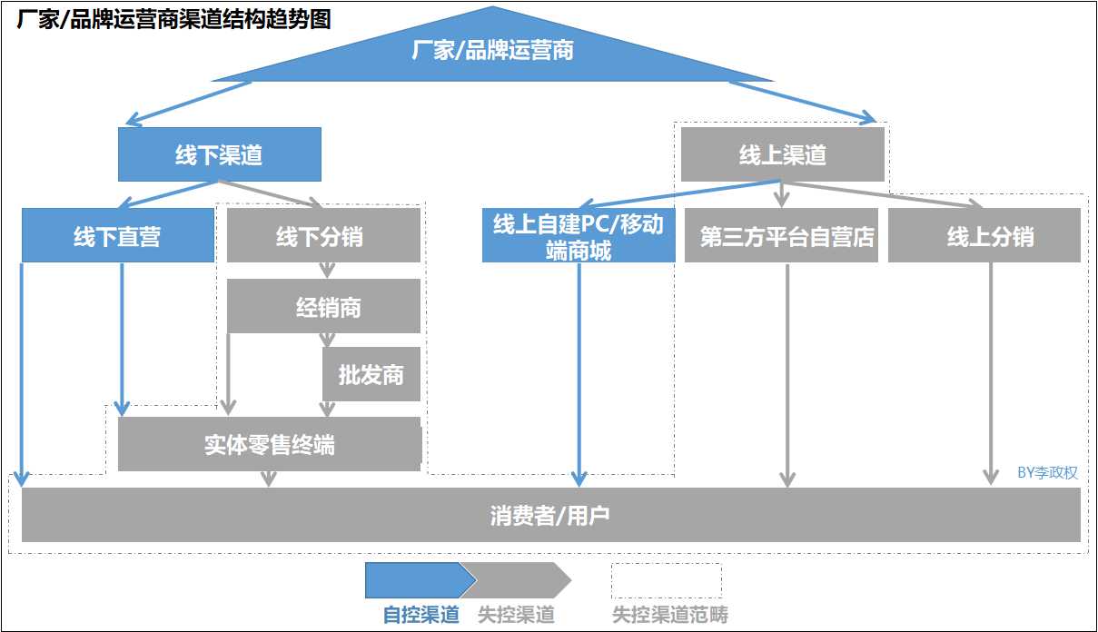 而现今时代,厂家/品牌运营商已经有条件跨过过去横亘在自己与消费者、用户面前的一座座“大山”——经销商、终端商通过电商、社交媒体等平台,以及通过二维码、小程序、会员系统等技术,直接采集、管理自身最末端的消费者与用户资源及数据,一旦自己掌握了这些资源及数据,大家就能直接针对消费者、用户开展经营和服务。