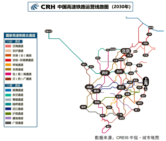 我国高速铁路近些年飞速发展,2016年《中长期铁路网规划》正式印发,预计到2020年我国高速铁路将达到3万公里,覆盖80%以上的大城市。到2030年,“八纵八横”建成将使全国高速铁路网基本连接省会城市和其他50万人口以上的大中城市,实现相邻大中城市间1至4小时交通圈,城市群内0.5至2小时交通圈。