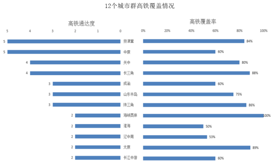 通过对城市群首位核心城市“八纵八横”高铁网络通达程度和当前高铁班次情况从总体上反映城市群高铁便捷程度。