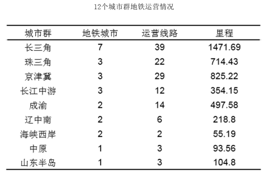 我们整理了各主要城市群地铁运营城市的数量、运营线路和里程,从总体上反映城市群城市内部交通便捷程度。
