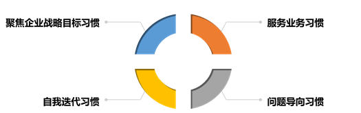 组织思维习惯是组织发展各类理念的汇集,这些理念都是在工作实践中历经考验的。组织思想习惯在企业发展进程中具有很强的指引性和指导性,核心内容主要有聚焦企业战略目标习惯、服务业务习惯、问题导向习惯和自我迭代习惯。