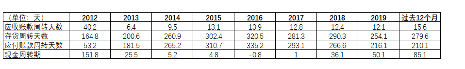 至于库存天数,过去12个月的数据= 365天/存货周转率 = 365/1.3次/年 = 279.6 天