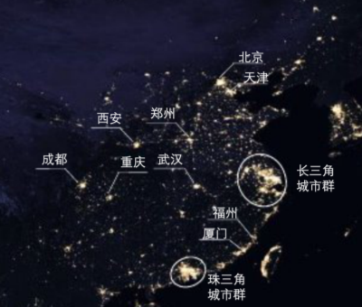 一方面,城市是人口自然集聚的产物,而城市群则是在人口基础上城市集聚的表现。中国城市的夜间灯光图直观显示了中国城市群的自然集聚状态,2016年的夜间灯光图直观表现出长三角、珠三角城市群形成大面积亮度较高区域,京津冀城市群中北京、天津亮度显著高于河北周边,更多城市群仅核心城市亮度较高,如长江中游城市群的武汉;成渝城市群的成都、重庆;中原城市群的郑州;海峡西岸城市群的福州、厦门;关中城市群的西安等。这也表明,这些城市群尚处在发展初期,核心城市虹吸效应远大于外溢效应,尚未形成区域间的联动发展。