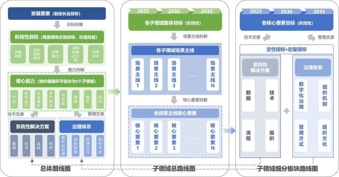 汽车企业数字化转型路线图包括三个组成部分,分别是总体路线图、子领域总路线图、子领域细分板块路线图,三部分逐层向下拆解,如图5.2。