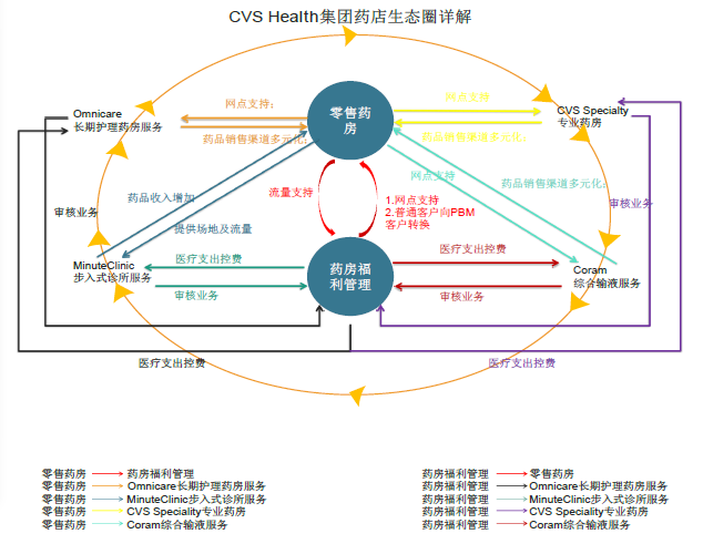 (1)核心生态圈:零售药房服务与药房福利管理服务之间;
