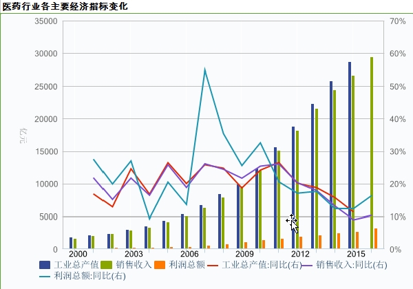 一是医药行业总体规模,医药制造业保持快速增长势头,其收入及利润总额基本上保持20%以上的增长速度;2016年医药制造业收入近29463亿元,同比为10.3%,利润总额近3201亿元,同比为16.4%。考虑到行业的高净利率,这个行业自然蕴藏着多家市值千亿公司的可能性。如图6-9所示。