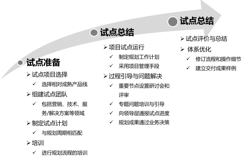某企业为解决资源配置不合理、产品研发缺乏前瞻性等问题,建立了崭新的产品规划流程,需要进行试点运行。图5-2展现了完整的推行计划。