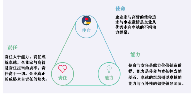 领导力建设要解决三个问题:一是使命的问题,企业家和高管的使命追求与事业激情是企业从优秀走向卓越的一个动力源泉;二是责任,责任是大于能力的,责任成就卓越,企业家和高管是责任担当的表率,企业真正的威胁来自责任的缺失;三是能力,能力是使命与责任担当的基石。如图1-10所示。