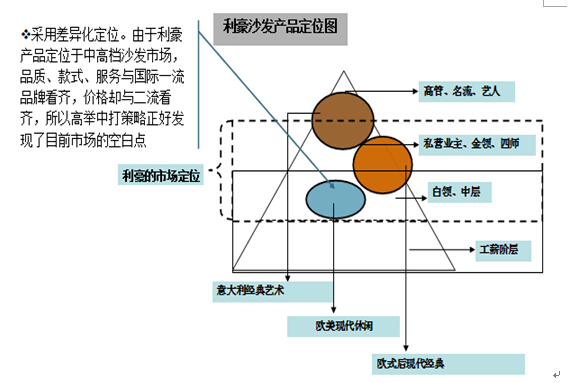 基于目前沙发行业的技术、自然、定制化的定位空间未被占领,考虑到生产成本的约束,定制化暂不考虑,于是,我们建议利豪沙发品牌定位为:健康、科技和舒适。