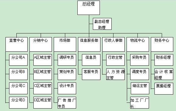 很多经销商在与厂家合作的过程中迷失了方向,依然以卖方市场的角色建立组织架构,只设立销售部门和财务部门。销售部门的功能单一,大多数销售部门认知还停留在推销认识阶段上。基于新的市场定位与职能,公司必须要有相应的组织架构来满足新的职能需要,从市场需求出发、以市场为导向重构组织架构,如增设市场部门、信息服务部门等,以服务产品、服务品牌的形式对产品进行营销活动。下面的案例描述了区域代理商组织架构的设置及核心业务流程的制定细节。