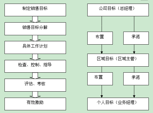 在保证实现公司目标的前提下层层分解,并在分解过程中上下沟通、达成共识。分解各个业务员的工作计划目标,包括销售计划、回款计划、终端拜访计划、网点开发和人员培训计划等指标为当月的考核指标。这样将公司总目标层层分解,并以当月的分解目标作为考核指标,可以指引营销人员为完成目标努力,从而将每个营销人员的目标与整个企业的目标统一起来。如图4-3、4-4所示。
