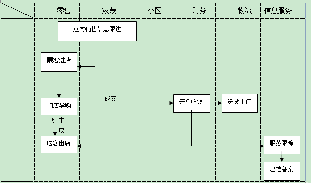 门店成交后,由住店收银员负责开出三联送货单,传至仓库,仓库发货完成客户签字确认后,传回财务部,销售完成。