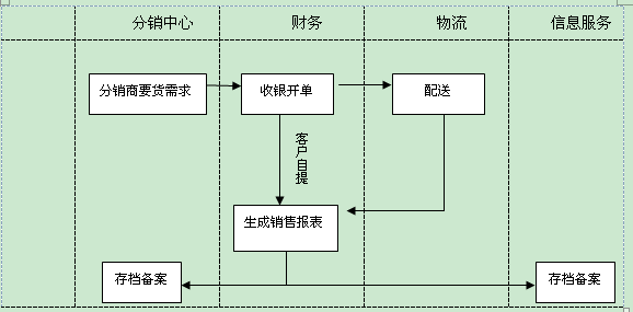 客户要货需求统一由分销部向财务部传递,在成交后由客户自提或仓库配送,并生成销售报表,以供查阅。