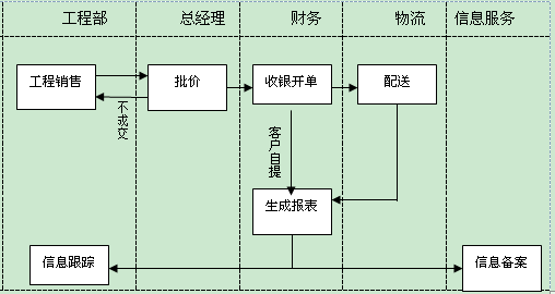 工程部将销售信息逐级上报批价,在权限范围内,确定价格、是否与客户成交。根据成交的协议由财务部负责收款并开出三联出库单,由仓库配送或客户自提。