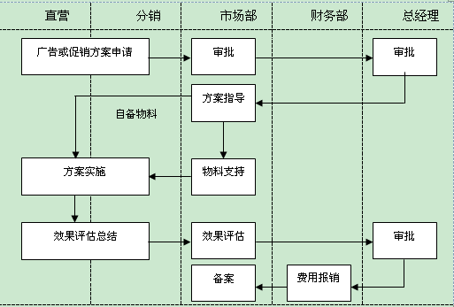 直营及分销系统将广告或促销活动方案传递给市场部,市场部在进行审批后报总经理审批通过。