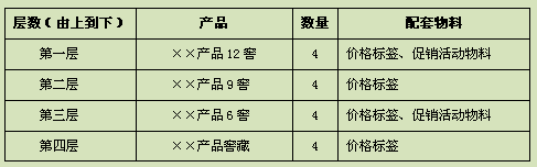 端架陈列:合作终端给予白酒产品一个独立的端架作为陈列面,不限产品系列,全部陈列××品牌产品。