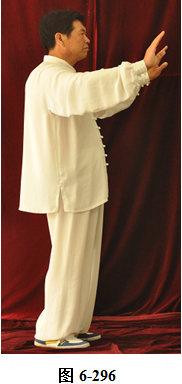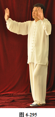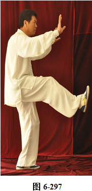 接上式,左脚蹬出后,腰向右后微转,身体向右后转,左脚随之下螺旋形绕落于右脚外侧,重心移向左脚。两臂屈伸,随身转向正东;腰向下沉,呈半蹲状,两掌变拳收至腹前,拳心朝上,眼神微向内敛,重心移落左腿;腰上提,两拳随腰上提变掌向两侧前方伸开。两前臂内旋微向下沉,右腿屈膝上提,脚尖朝上,用脚跟向前蹬出,眼神注视右脚前方(见图6-295至6-297)。