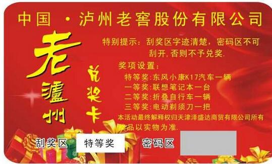 盒内奖、盖内奖是白酒促销常见的消费者拉动方式,是消费者拉力的体现。刮奖卡上列明奖项设置,消费者通过刮开涂层即可得知自己是否中奖及中了几等奖。奖项设置常包括酒票、烟、现金、美元、贵金属制品、精美纪念品、生活用品等,形式多种多样。做刮刮卡的促销同样要进行消费者活动告知和市场监察督导,防止终端截留促销品。同时要注意利用大奖引爆和100%中奖率,使得消费者持续关注,形成促销热点。