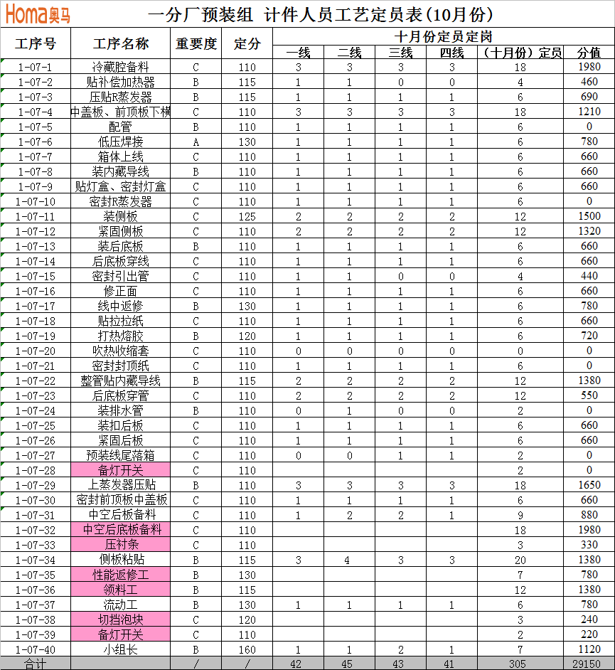 项目 | 产线平衡 | 工艺定员 | 人均小时产量 | 平均日产量 |