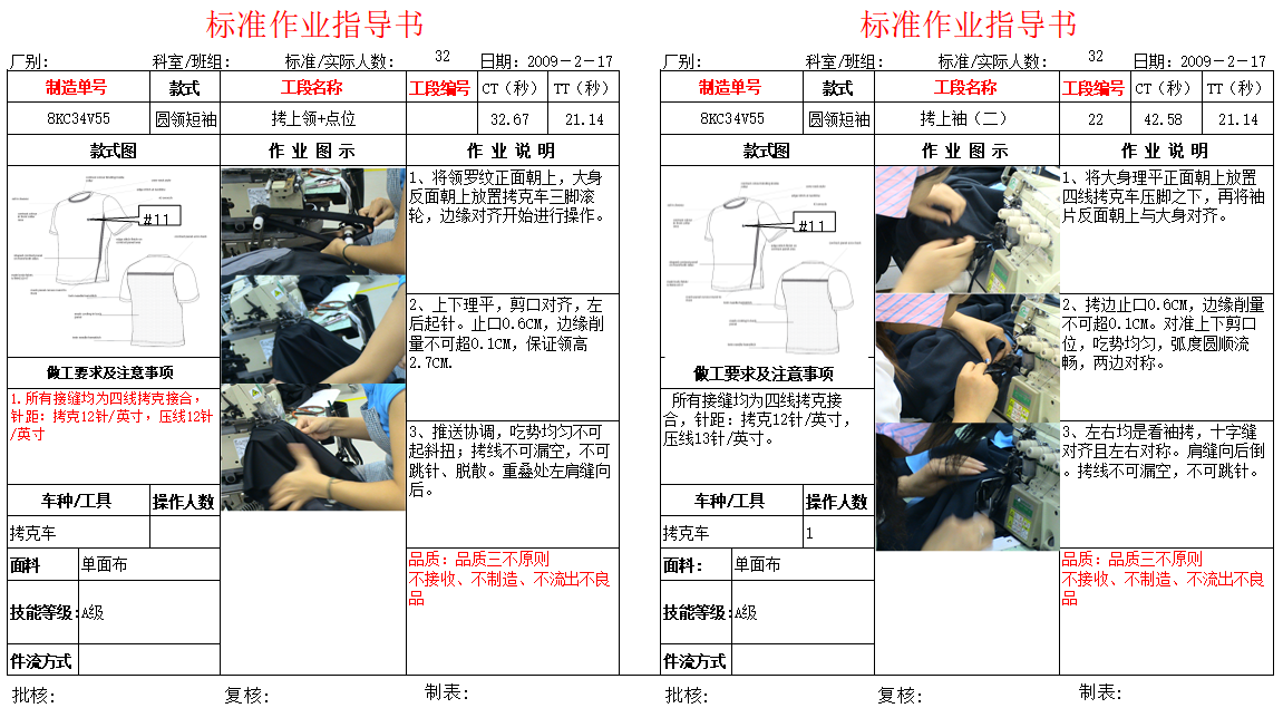其次,关于SOP的制作。之前在服装行业推行SOP相对来说是比较难的,当时我们制作的SOP没有起到100%的作用,只是起到一个指引的作用。因为,对于服装行业来讲,缝纫工序相对来说,是一个比较有技术的工种,需要一定的技能和熟练程度。由于服装工序是人与设备融合的过程,在描述工序内容的时候,很难做到描述得很贴切实际。所以,服装工序SOP,只能是一个操作指引,不能够做到让员工100%按照SOP去执行,图1-22为当时在服装公司制作的SOP: