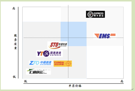 在快递市场现有竞争格局上,从单票价格和服务质量来看,顺丰价格高、服务质量好,EMS价格高但服务比不过顺丰。当然这里的服务质量指的是一个综合的概念,包括速度、网络覆盖、标准等,但EMS在网络覆盖上是无人能出其右的。如申通只有8000个网点,而EMS36000个,所以EMS整体的服务质量是比“三通一达”要高的。“三通一达”基本属于低质低价竞争,当然目前它们也有向顺丰努力靠拢的趋势。