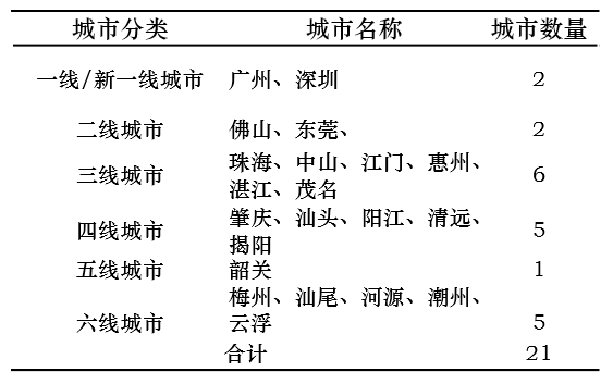根据新一线城市研究所最新的城市分类,珠三角城市群21个城市共有一线及新一线城市2个、二线城市2个、三线城市6个、四线城市5个、五线城市1个、六线城市有5个。