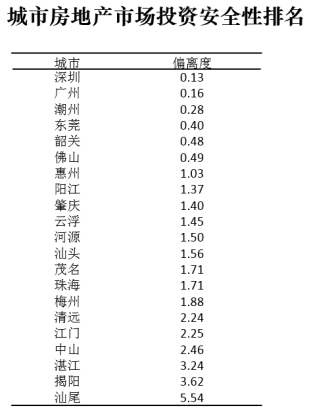 珠三角城市群城市房地产投资安全性综合排名TOP3的城市为:深圳、广州、潮州。除深圳、广州、潮州、东莞、韶关、佛山之外的城市偏离度均大于1,投资风险较高,应谨慎投资。