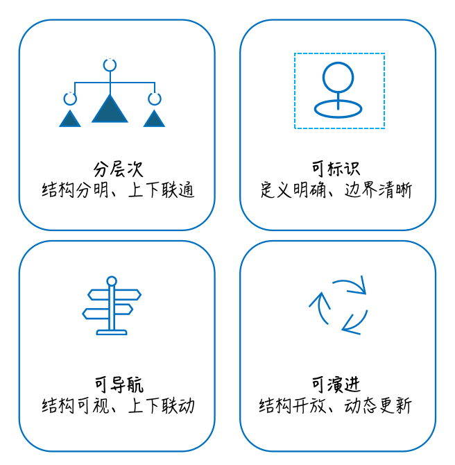 一个高质量的概念体系架构,通常具备以下四个关键特性,决定了知识体系是杂乱堆叠,还是能够有机生长、持续演化,如图2-1所示。