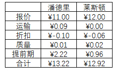 尽管潘德里价廉物美,不过达尔乐并非完全考虑这些因素,在提前期存在分野的情况下,达尔乐通过量化比价,最终选择了莱斯顿作为此次订单的供应商。