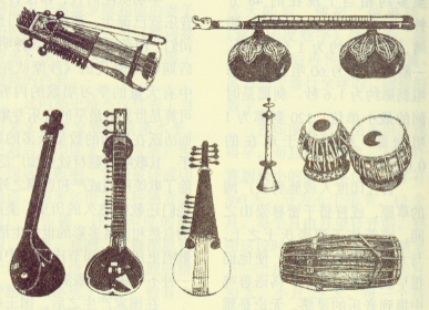 《舞论》是印度音乐理论方面最古的专门文献,它以歌诀式诗体写成,广泛地论及音乐。《舞论》较科学地把乐器分为4类:弦乐器、革鸣乐器、体鸣乐器和气鸣乐器。印度音乐主要使用各种类型的鼓、笛子和维拉,其中以打击乐的鼓为主,如托尔鼓、波卡维吉鼓、黑杰尔鼓等。印度现在最为有名的乐器叫维拉,最常见的为7弦,琴头下弯,琴的下方有两个葫芦状的共鸣箱,与中国的琵琶有“血缘”关系。