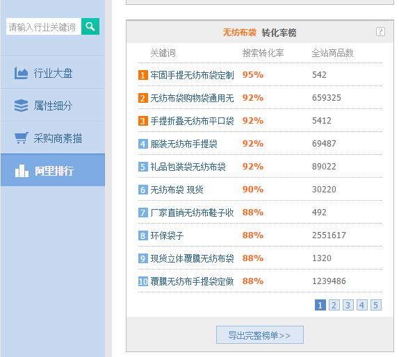 4)参考同行标题关键词的同时,还应该关注阿里指数的阿里排行中的上升榜、热搜榜、转化率榜。这里要说明一下,取词时要注意:看上升榜,选词时一定要选搜索趋势高、搜索指数高的词,而且是选最近30天的(可以每天都把榜单倒出来,然后综合一下,取出现最多也就是搜索趋势一直都高,搜索指数一直都大的);热搜榜选择时道理类似,选择关键词应该是搜索指数高,全站商品数少的关键词,这个少是相对的少,同样是选30天榜单倒出来,每天倒然后综合起来选出现最多、搜索指数高、全站商品数少的。如图4-4、4-5所示。