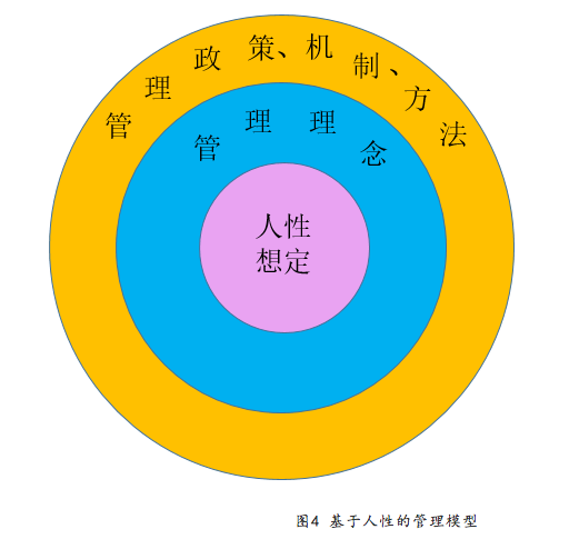 如果进一步思考,我们就会发现要想激发一个团队的价值创造活力,打造一支“铁军”,关键在于基于人性的管理。由此形成三个层次:第一个层次是企业文化的鼻祖沙因所说的“人性假设”。这个词不好理解,我将其改为“人性想定”,就是对人性的理解,对人性的设想。第二个层次是与人性对应的管理理念和原则。第三个层次是由管理理念、原则衍生出来的管理政策、机制、方法等,这就是《道德经》中所说的“道生一,一生二,二生三,三生万物”。