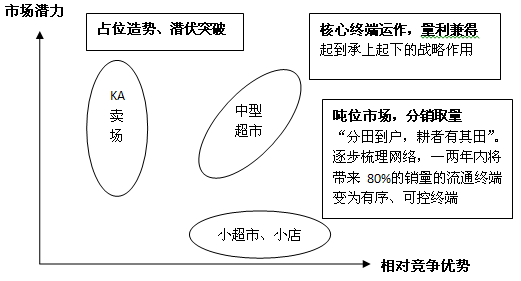 将商圈内各种类型的终端进行不同的定位组合,然后依据“建设形象终端、扶植主力客户、提升常规网点、延伸现有网络”形成商圈内“KA造势,分销取量”的终端联动模式。