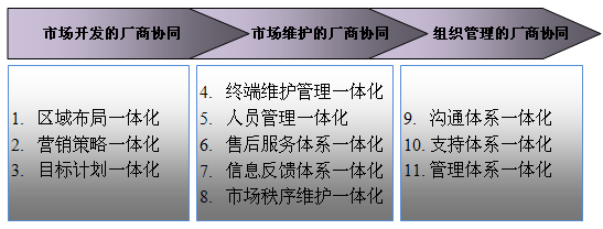 在渠道结构布局合理的基础上,渠道的推力往往体现在渠道的合作关系上。在渠道关系上,厂家和渠道的关系从博弈到战略合作,以及帮助渠道深化能力提升,将是竞争的关键,这也是我们在营销模式构建中首次提出厂商价值一体化的原因。