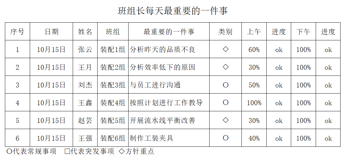 在第一篇里面说明了班组长的标准作业内容,标准作业明确了班组长每天必须做的事情,但是并没有明确一天中最重要的事情是什么。班组长的反思能力强调的是班组长需要明确每天中最重要的一件事情,并且将他彻底的完成。当班组长没有按时完成每天最重要的一件事情时,班组长需要反思没有完成的原因是什么,并且能够及时的进行改进。